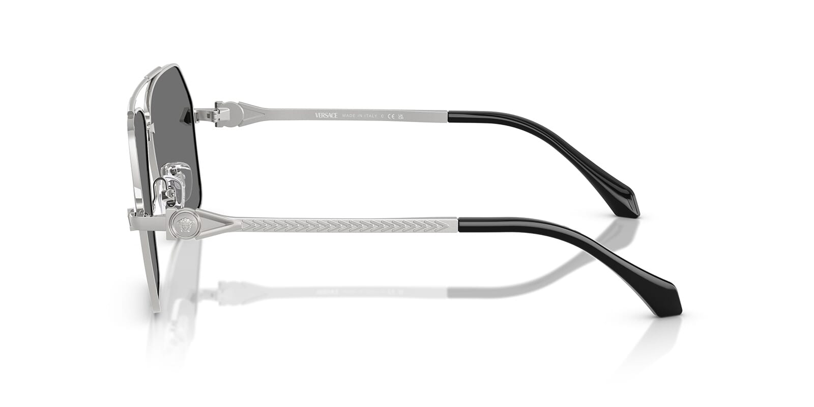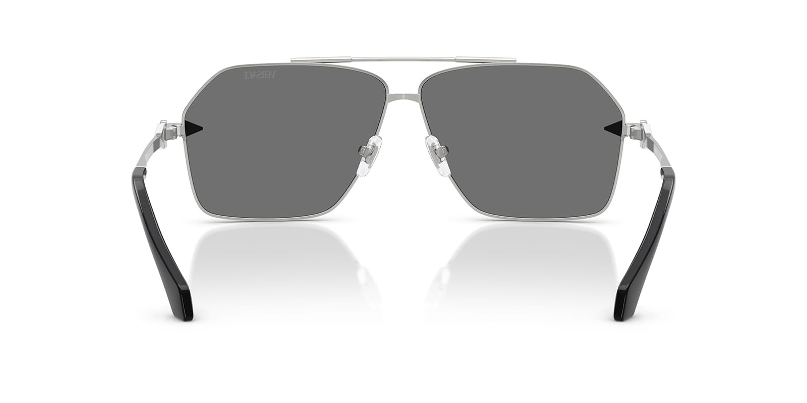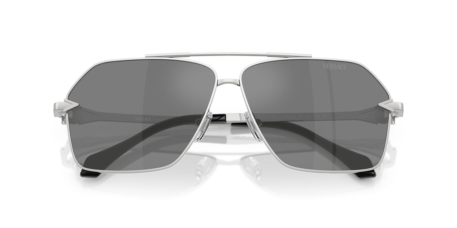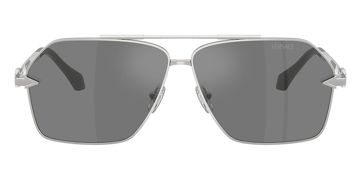 This aviator Versace sunglass comes in a silver frame with grey with silver mirror lenses.