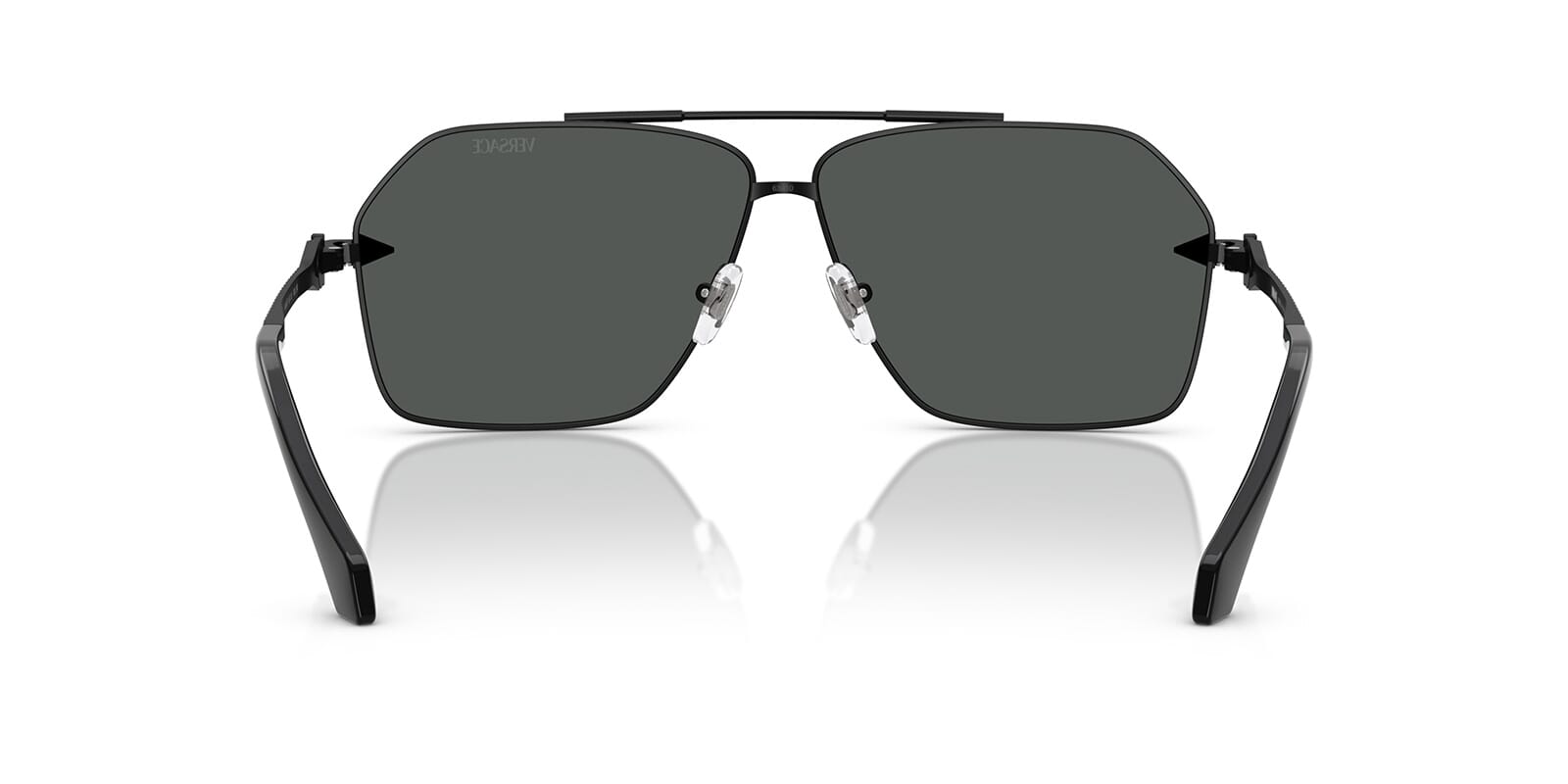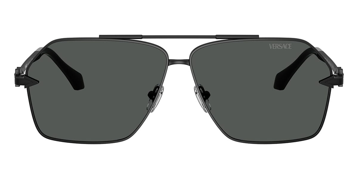 This aviator Versace sunglass comes in a matte black frame with dark grey lenses.