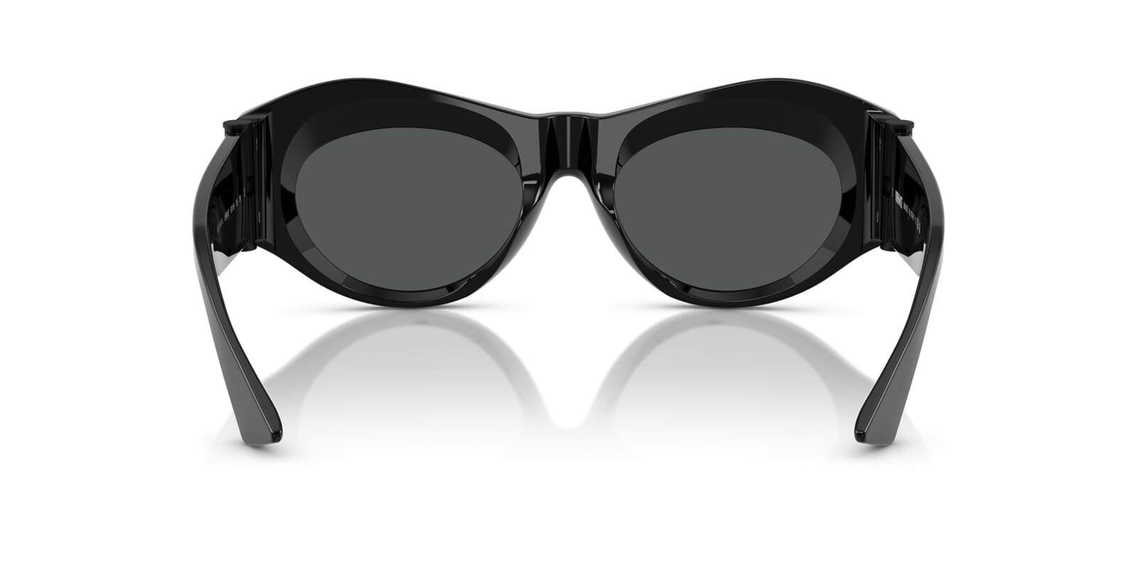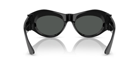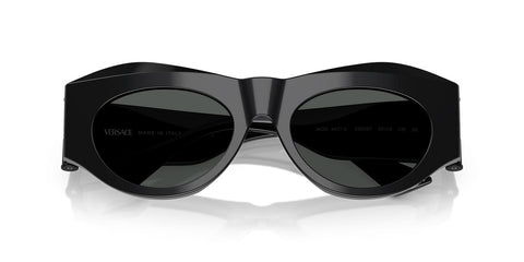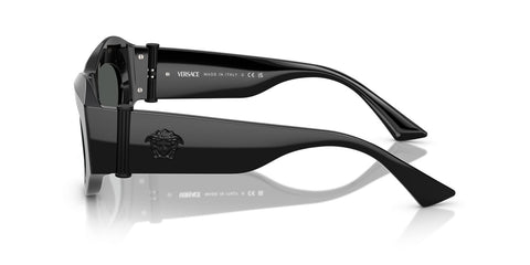 This round Versace sunglass comes in a black frame with dark grey lenses.