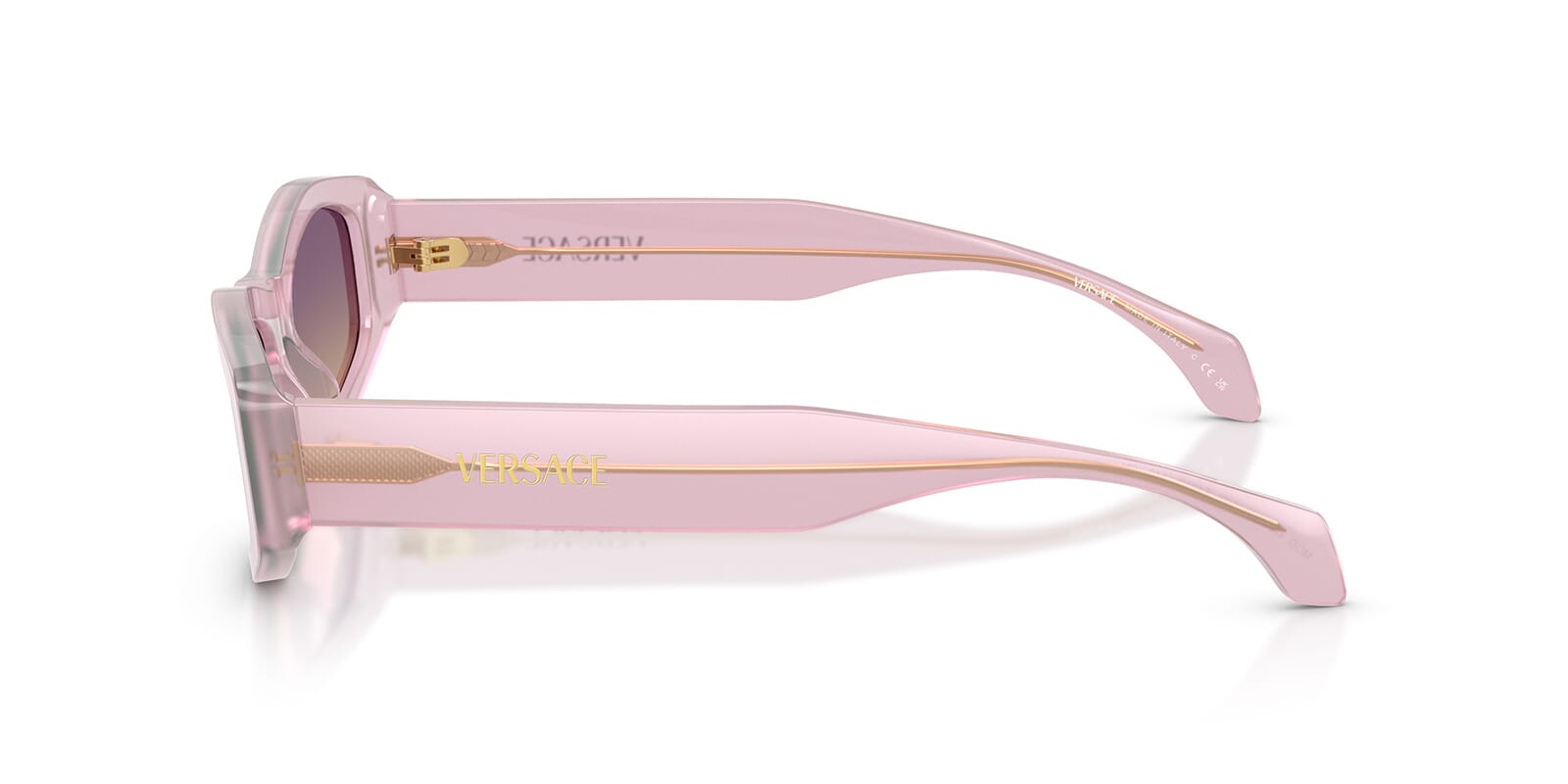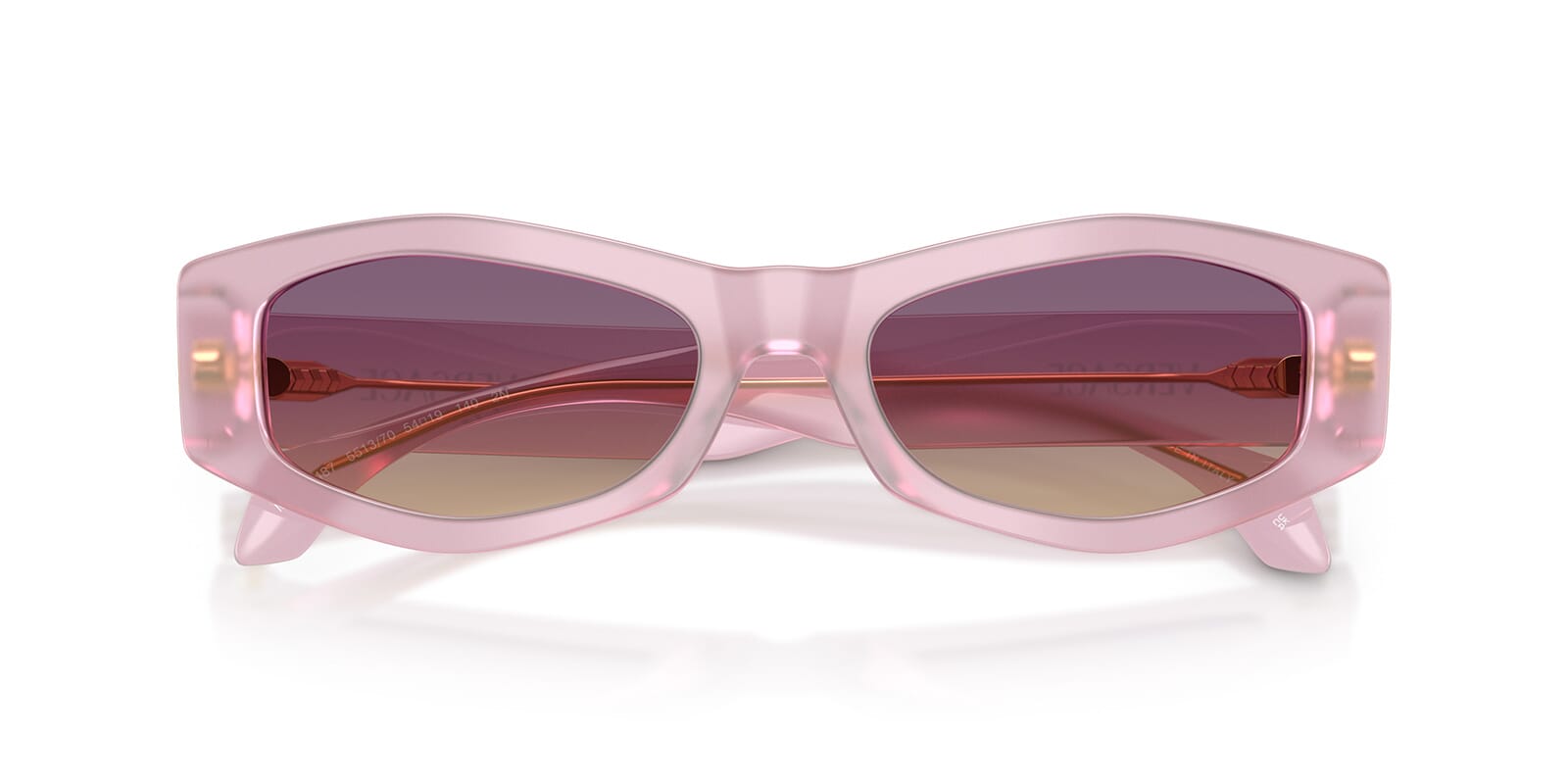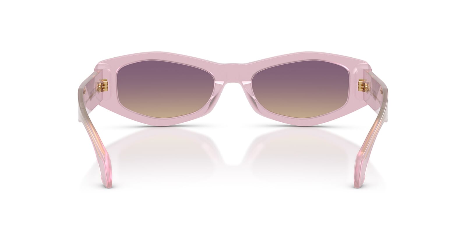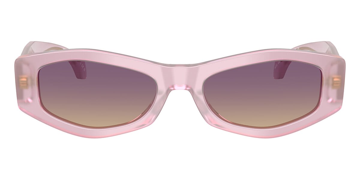 This rectangular Versace sunglass comes in a opal lillac frame with yellow and violet gradient lenses.