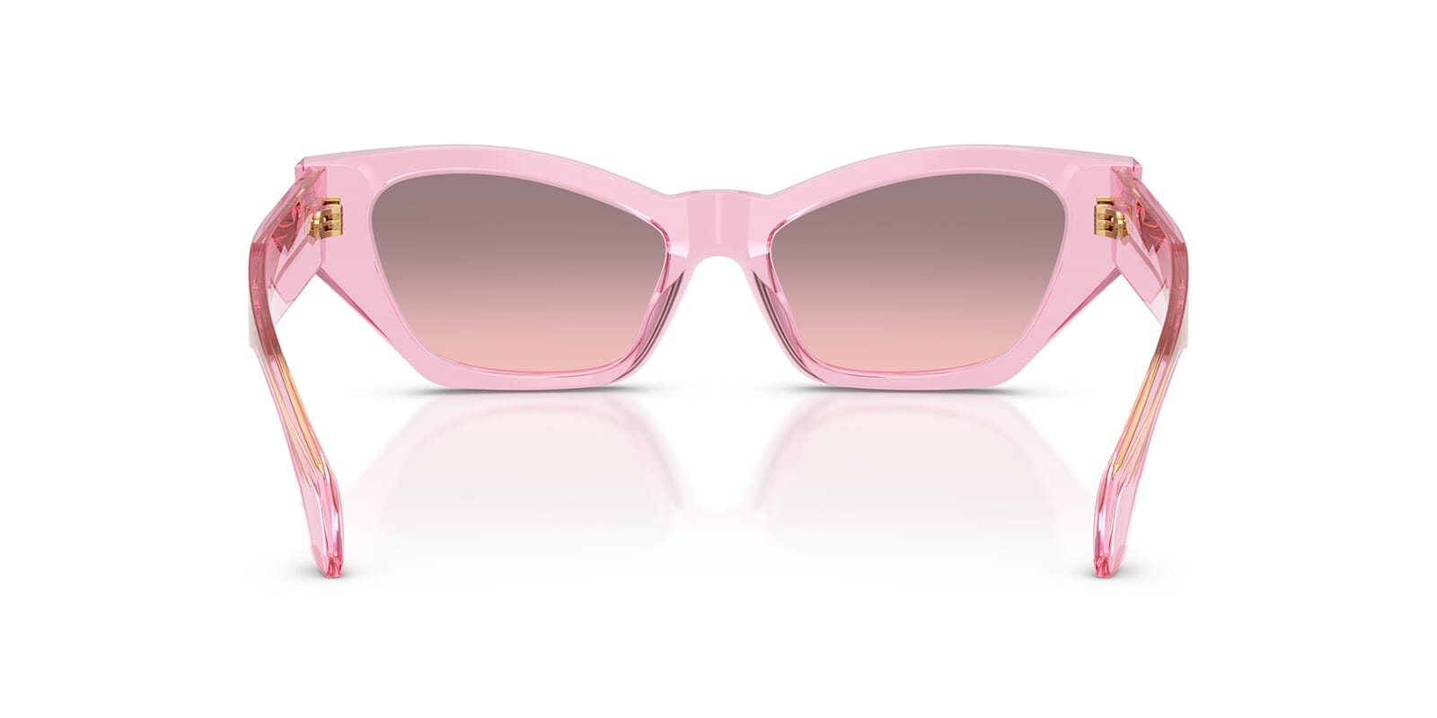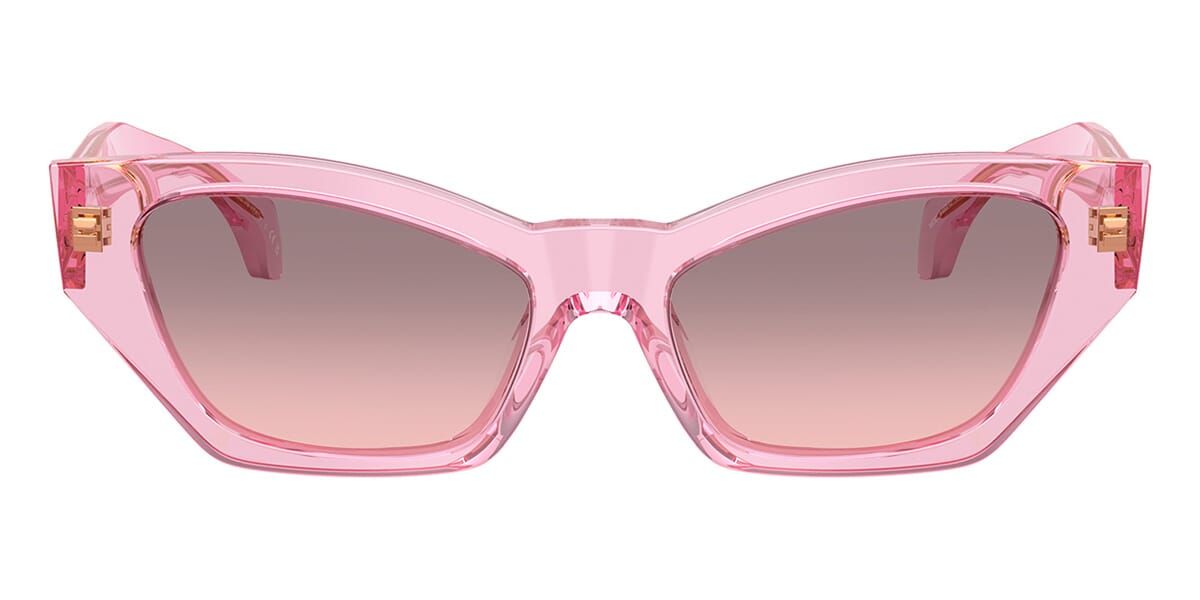 This cat eye Versace sunglass comes in a transparent rose frame with rose grey gradient lenses.