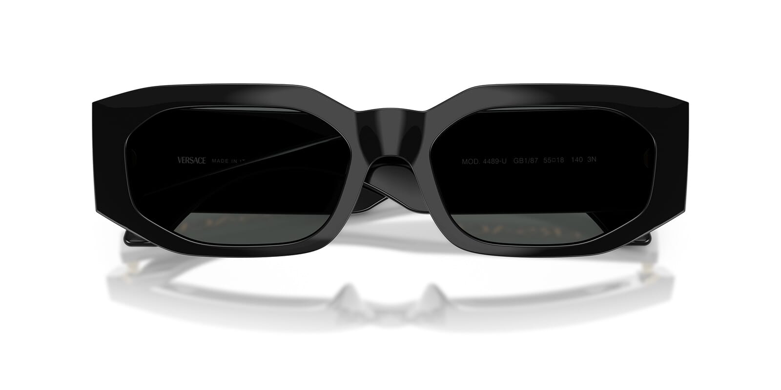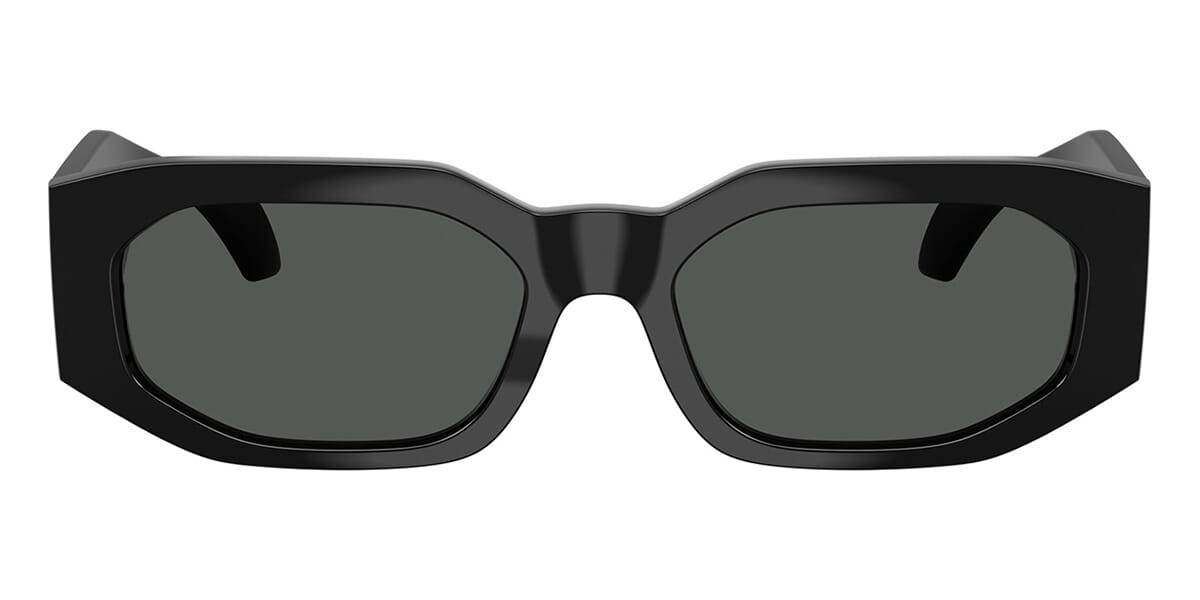 This rectangular Versace sunglass comes in a black frame with dark grey lenses.
