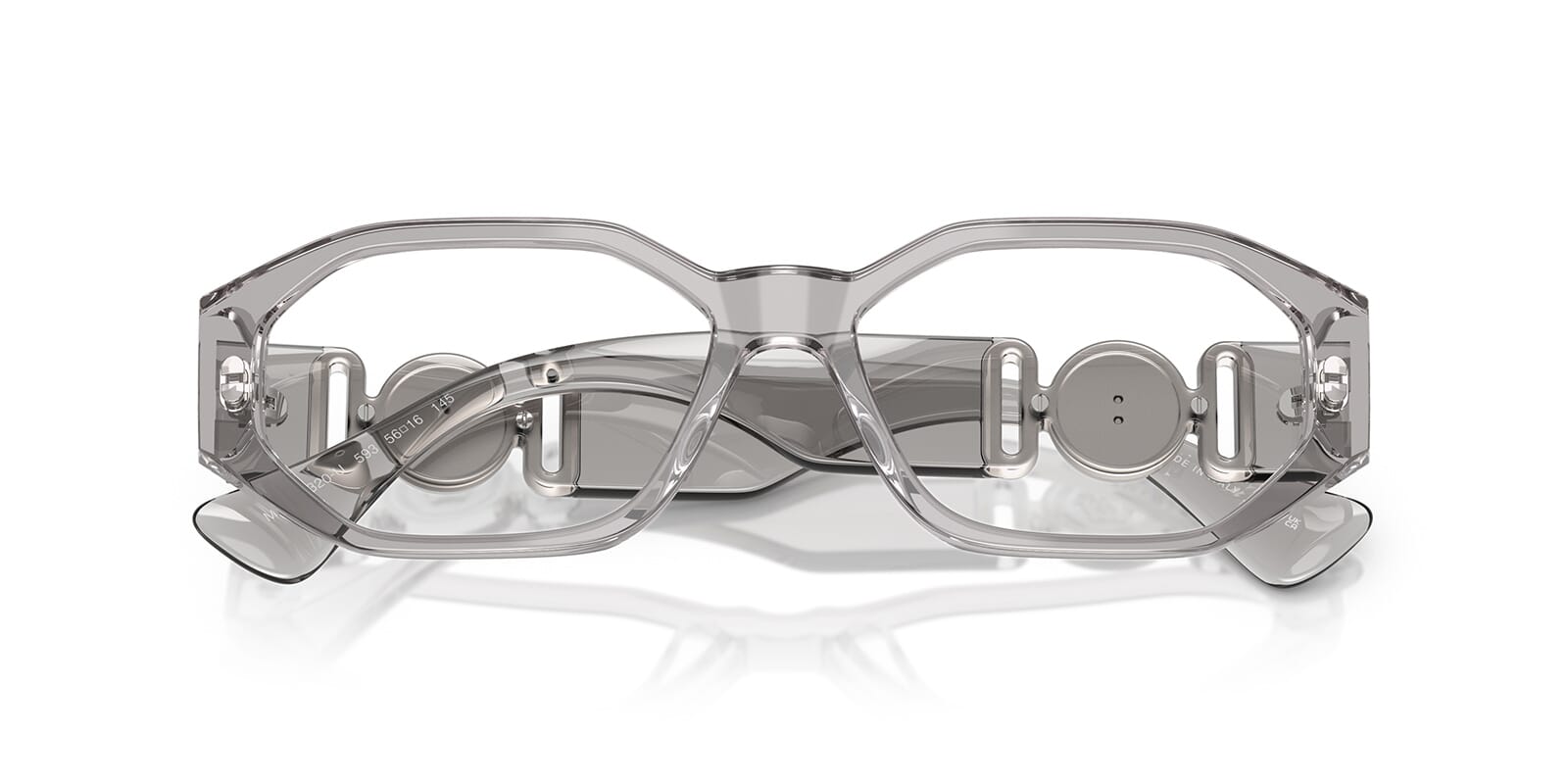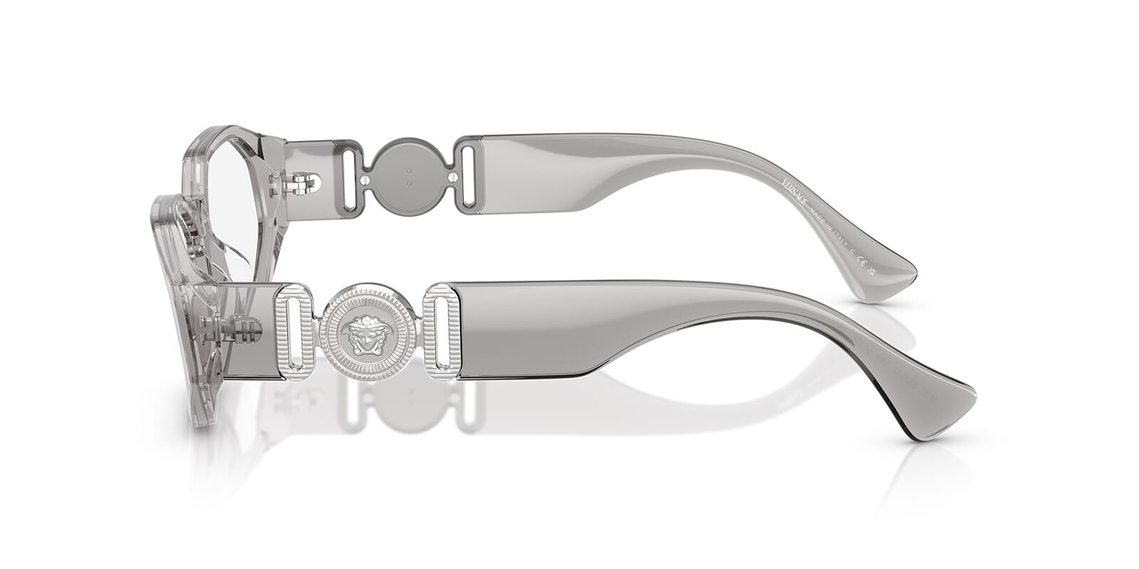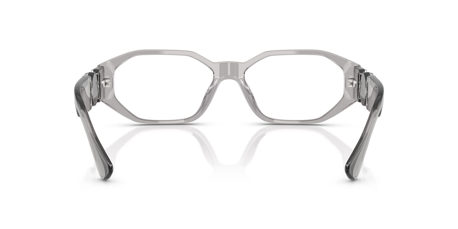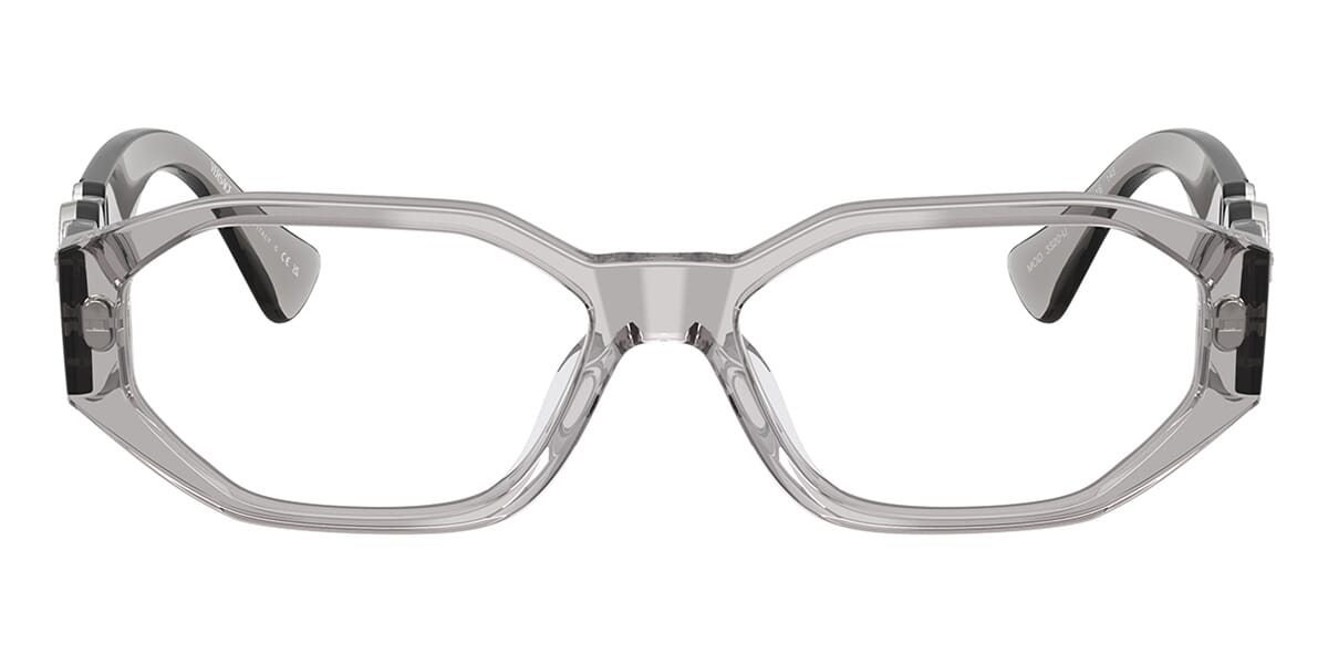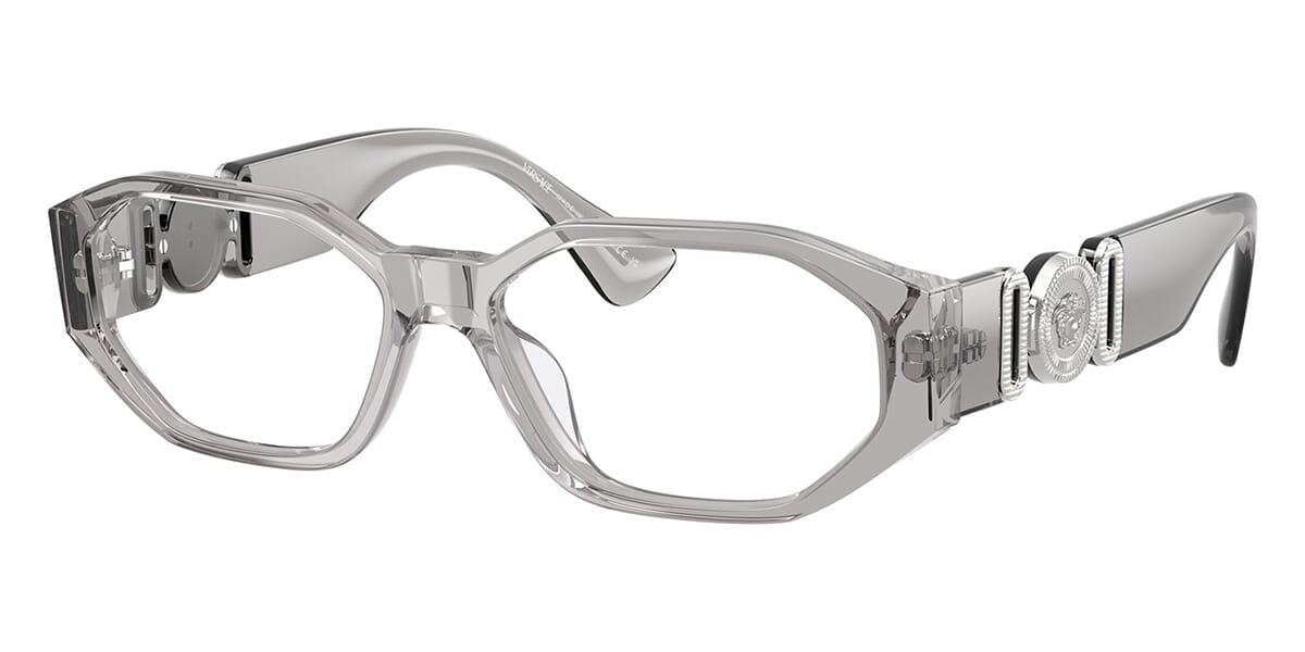 This rectangular Versace optical comes in a grey crystal frame.
