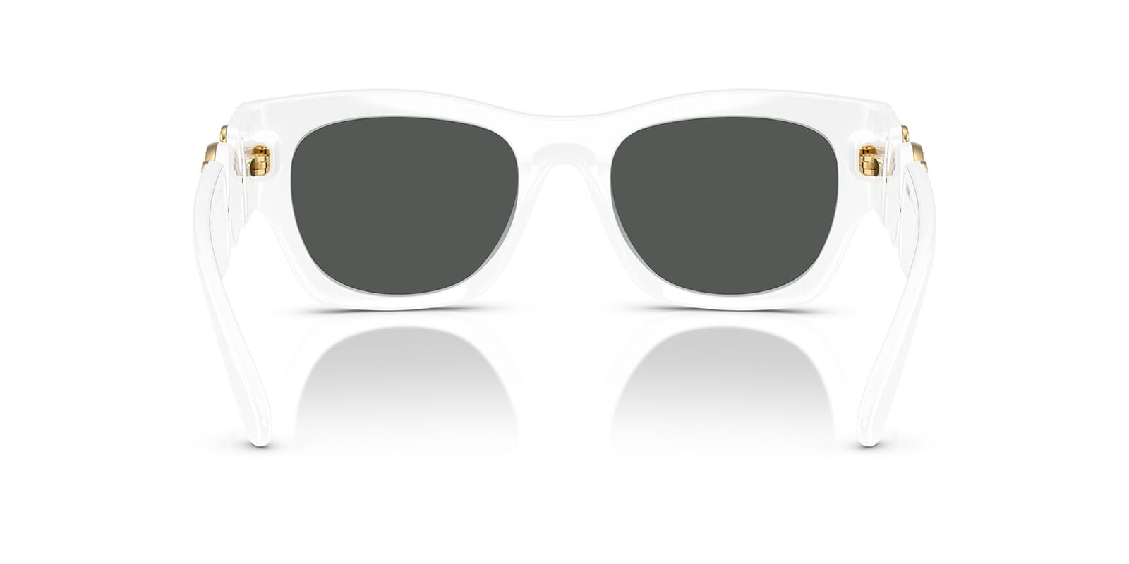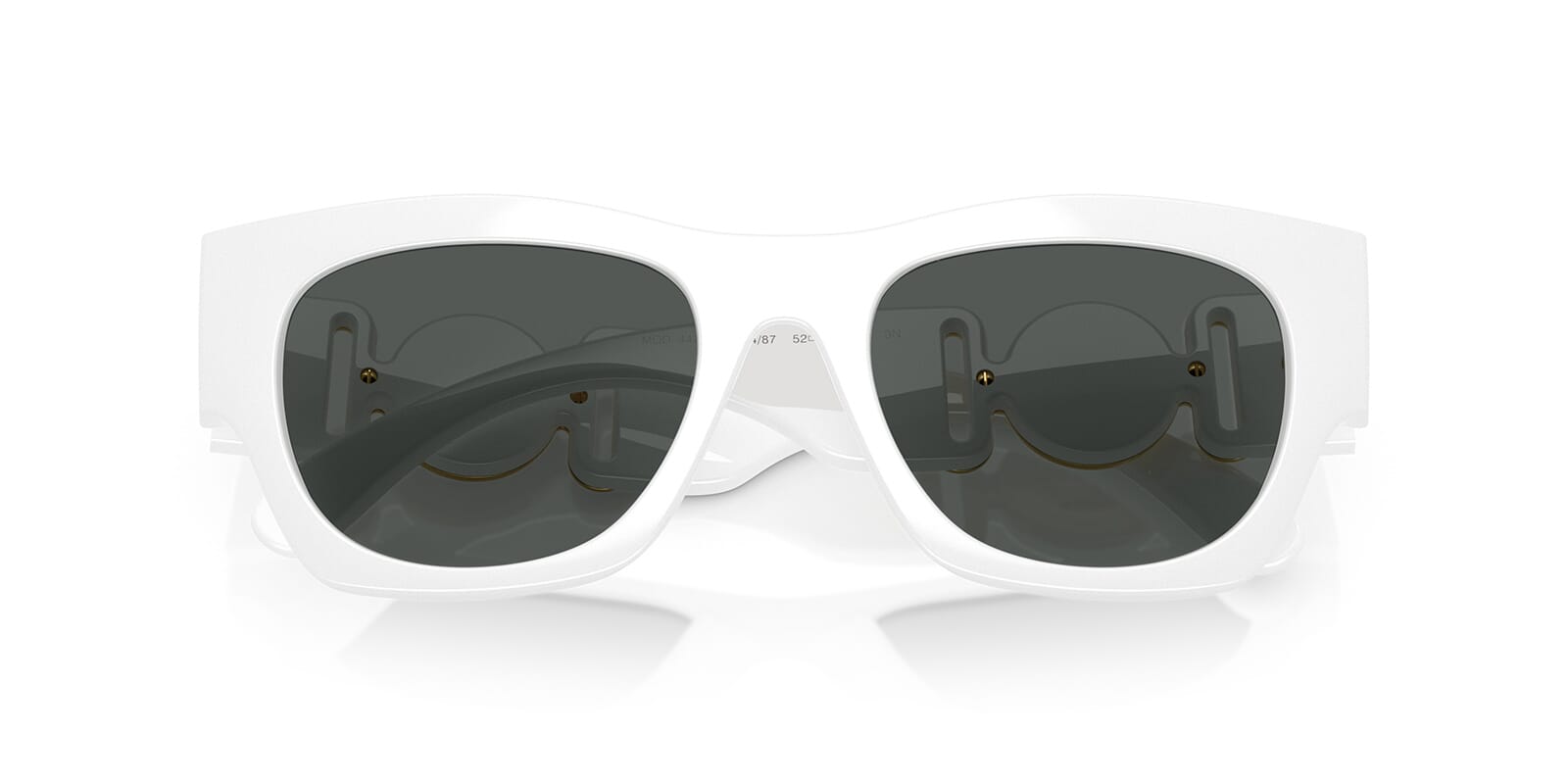 This rectangular Versace sunglass comes in a white frame with dark grey lenses.