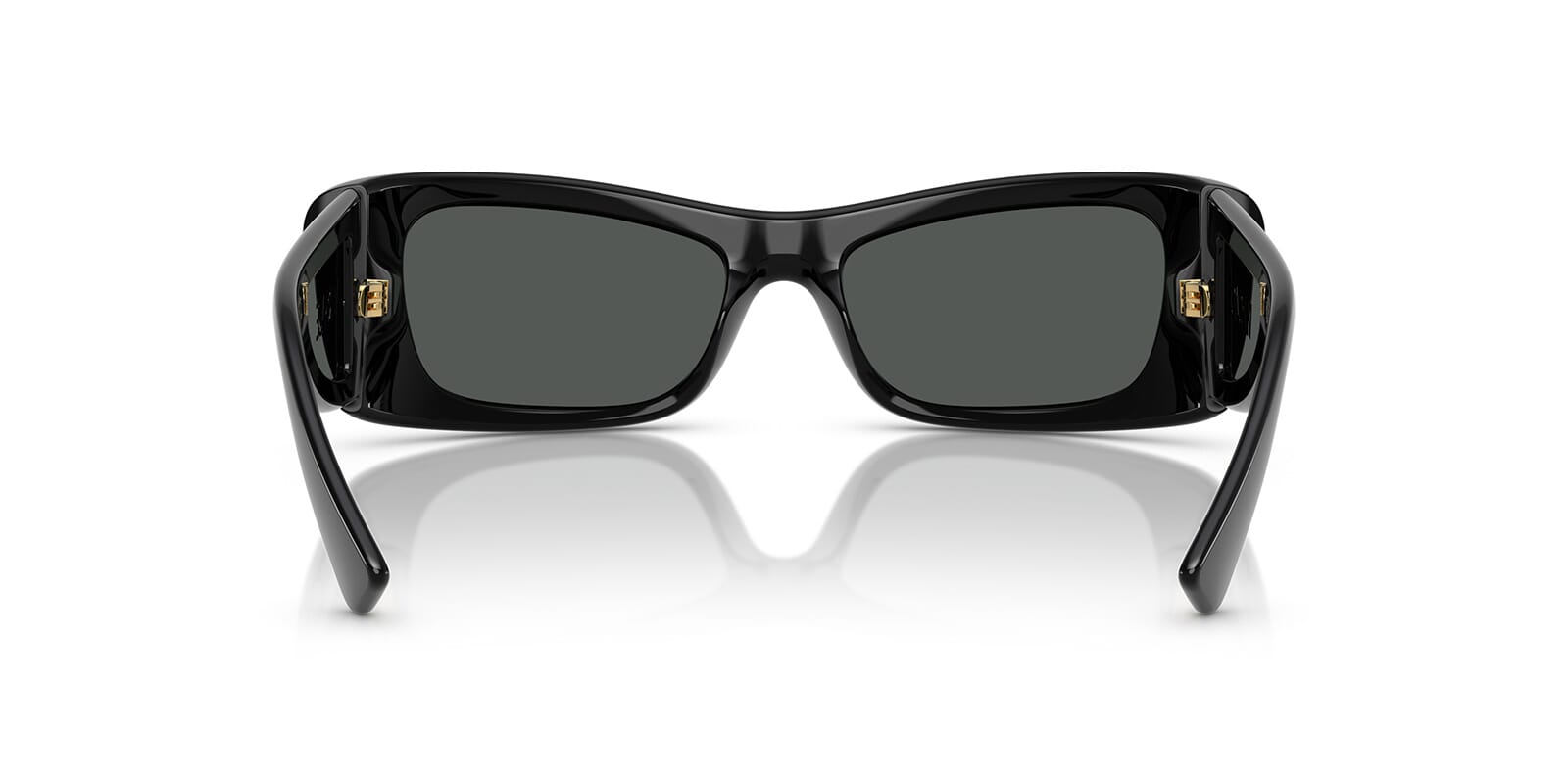 This rectangular Versace sunglass comes in a black frame with dark grey lenses.