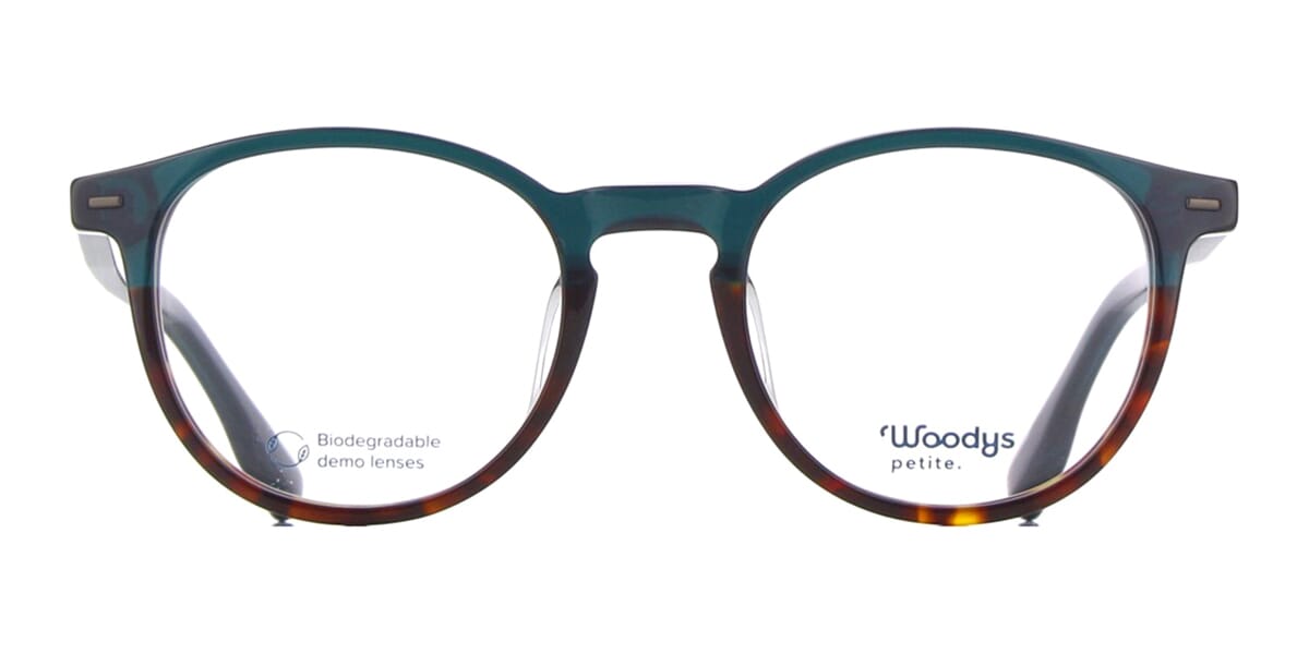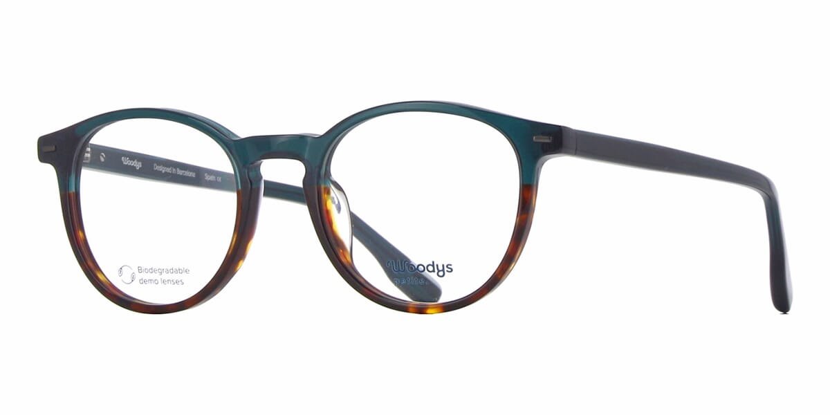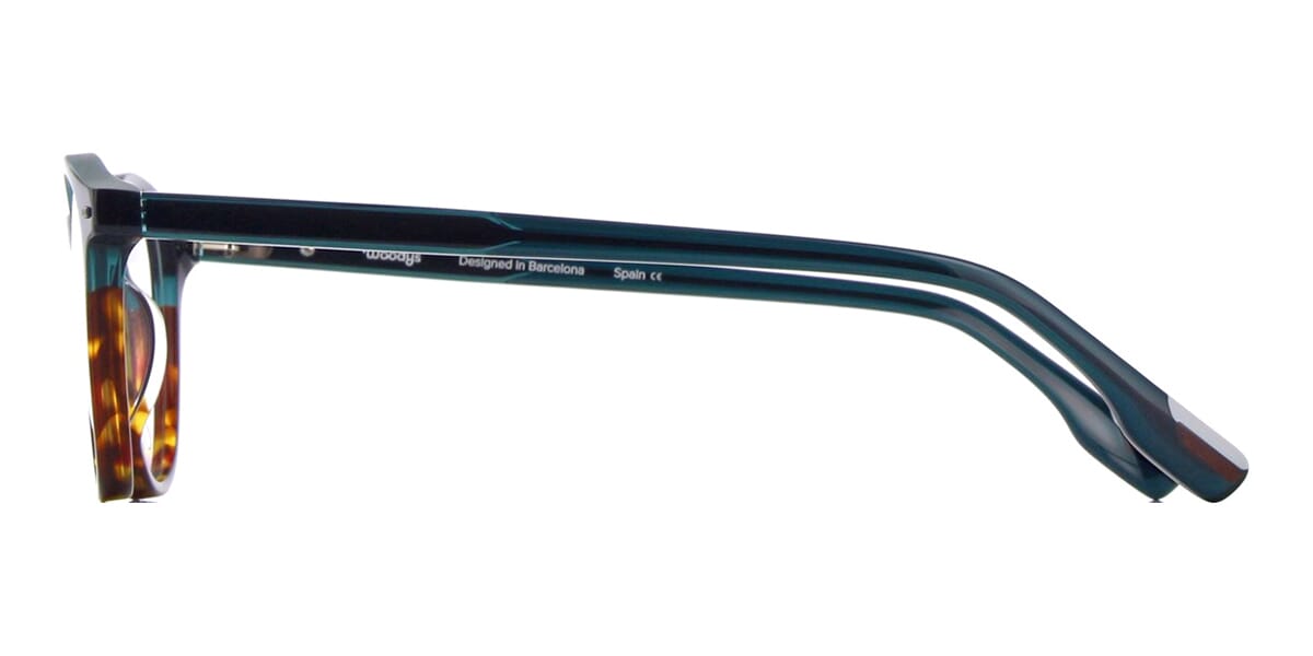This square Woodys optical comes in a shiny green and dark havana frame.