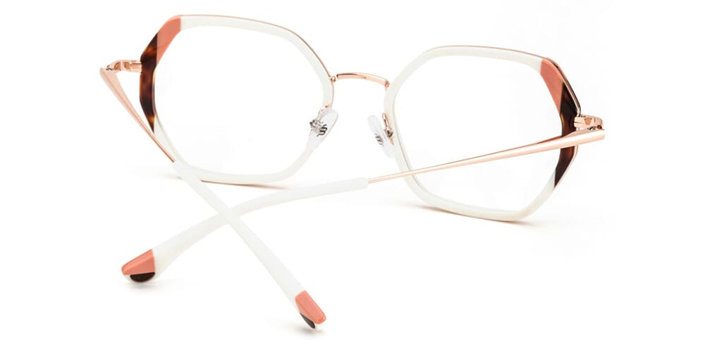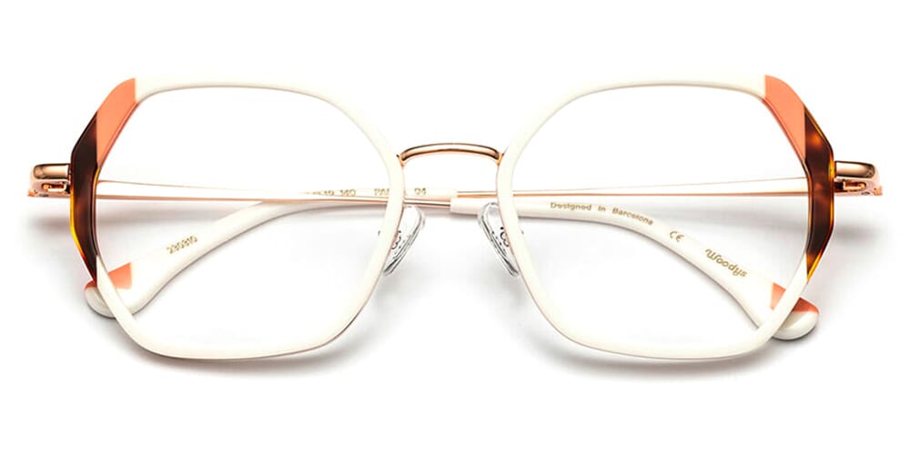 This square Woodys optical comes in a white with pink and dark brown havana frame.