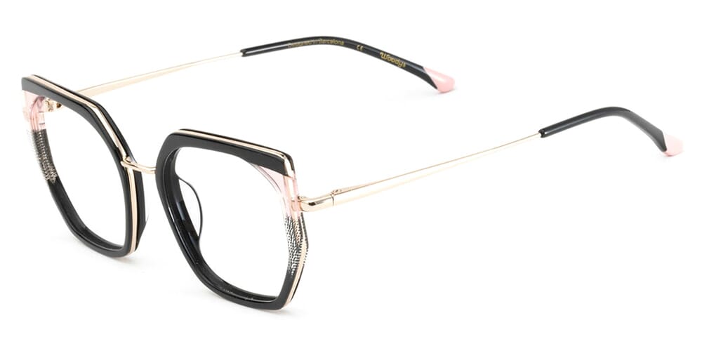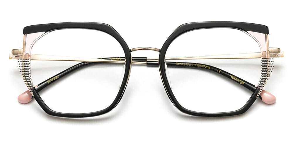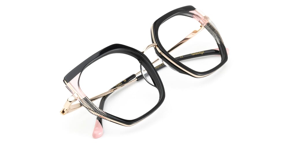 This square Woodys optical comes in a black with striped crystal and gold frame.