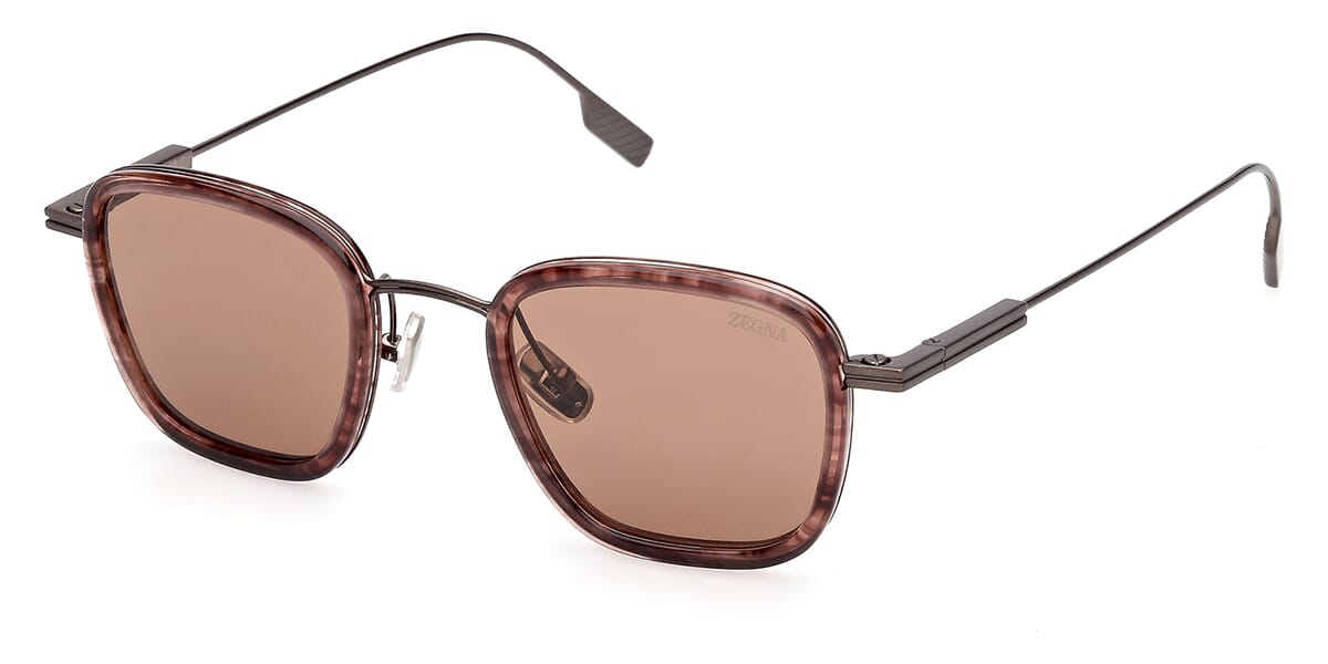 This square Zegna sunglass comes in a bordeaux striped with matte grey frame with light bronze lenses.